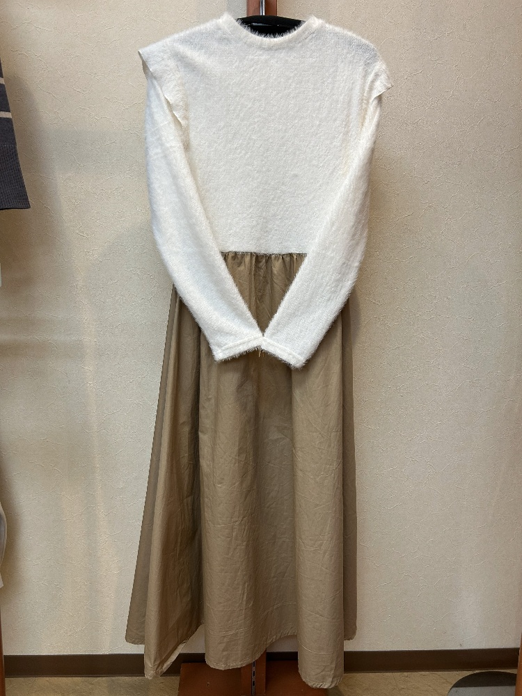 上がシャギーニット、下が布帛のワンピース
